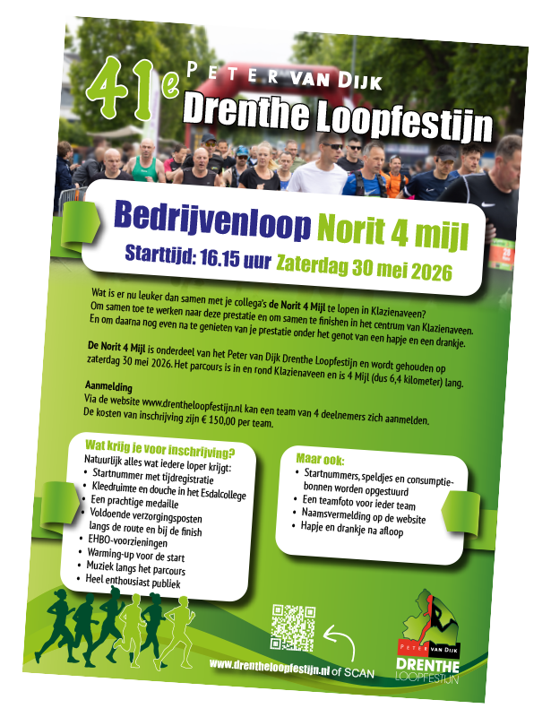 Laatste nieuws: Winnares Marathon Drenthe Loopfestijn 2025 verkozen tot sportvrouw van het jaar 2025 gemeente Emmen Peter van Dijk Drenthe Loopfestijn 41e editie Zaterdag 30 mei 2026 Schuler Afbouwgroep Kidsrun (6-9 jr.) Schuler Afbouwgroep Kidsrun (10-12 jr.) Esdalrun Norit 4 mijl Bedrijvenloop Norit 4 mijl JMS Techniek 10 kilometer EME Halve marathon Peter van Dijk Marathon Draagt u het DLF een warm hart toe? Download dan hier ons sponsordocument en meld u aan als (afstand-) sponsor.